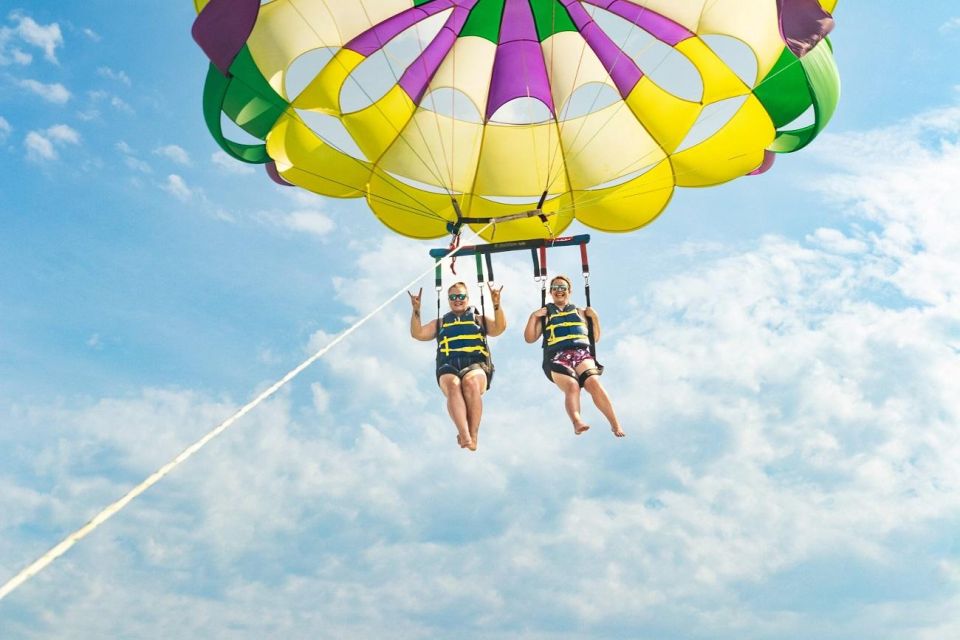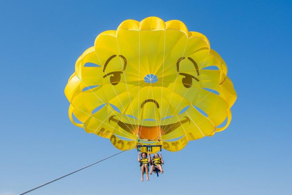 A person (or two persons may ride simultaneously) is towed behind a boat while tethered to a parachute in this recreational sport. The parascender is then lifted into the air as the boat departs. The parascender’s control over the parachute is minimal at best.